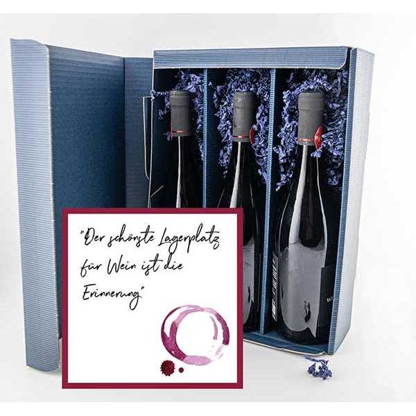 Ein eleganter Geschenkkarton aus offener Welle in edlem Dunkelblau – außen wie innen harmonisch aufeinander abgestimmt. Die stabile Einlage aus ebenfalls dunkelblauer Welle sorgt für sicheren Halt von bis zu drei Flaschen Wein oder Sekt. Das dekorative, blaue Papierfüllmaterial verleiht dem Präsent eine ansprechende Optik.